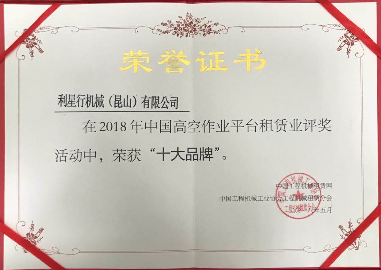 利星行機械(昆山)有限公司榮獲由“中國工程機械租賃網”和“中國工程機械工業協會工程機械租賃分會”聯合授予的2018中國高空作業平臺租賃業“十大品牌”榮譽稱號。