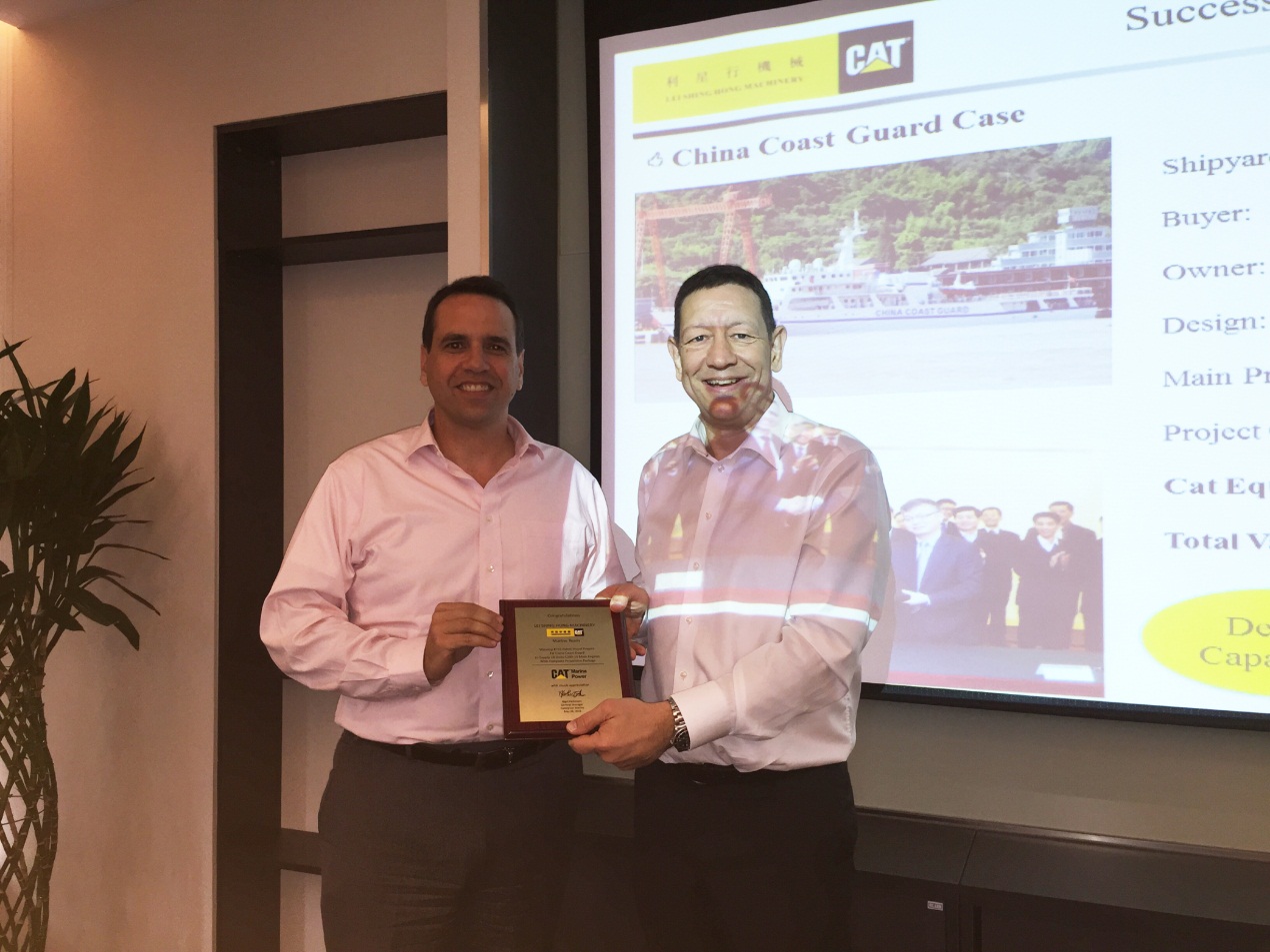 2015年5月26日,卡特彼勒船舶部董事總經(jīng)理Nigel Parkinson及亞太區(qū)銷(xiāo)售經(jīng)理陳耀明先生帶領(lǐng)其團(tuán)隊(duì)成員到訪利星行機(jī)械發(fā)動(dòng)機(jī)事業(yè)部。為了表彰利星行機(jī)械船機(jī)組在中國(guó)政府船市場(chǎng)中取得如此傲人的佳績(jī),Nigel Parkinson先生向利星行機(jī)械船機(jī)組銷(xiāo)售總經(jīng)理洪波先生頒發(fā)了榮譽(yù)獎(jiǎng)牌,并對(duì)該項(xiàng)目團(tuán)隊(duì)成員做出的貢獻(xiàn)與努力給予了高度的評(píng)價(jià)和肯定。