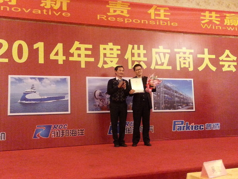 新年伊始,南通潤邦海洋工程裝備有限公司2014年度供應(yīng)商大會在江蘇南通隆重舉行,來自全國各地的150家供應(yīng)商二百余名代表, 潤邦股份董事長、總裁及相關(guān)負責人參加了此次盛會。在當晚最受矚目的2014年度優(yōu)秀供應(yīng)商頒獎環(huán)節(jié),利星行機械(上海)有限公司不負眾望地獲得了南通潤邦海洋工程裝備有限公司“2014年度優(yōu)秀供應(yīng)商”榮譽稱號,利星行船舶動力部銷售總經(jīng)理洪波先生代表公司接受了這份榮譽并對進一步加強雙方合作和共同捕捉商業(yè)機會進行了展望。